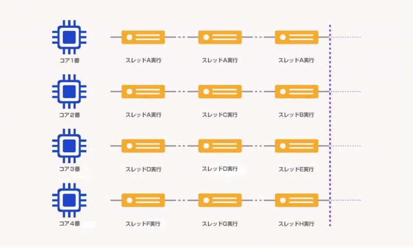 もし、4コアのCPUであれば、OSの4つのスレッドが同時に実行できることを意味します。ここで重要なポイントは「同時実行」が4つまで可能であることで、スレッド数が最大4つである必要はありません。