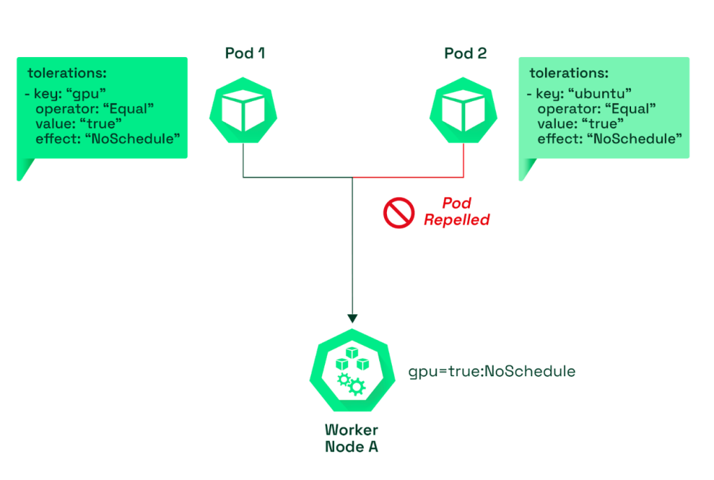 TaintとTolerationsの差はTaintの設定はノードへの設定で、torelationの設定はPodに設定することです。Taintをノードに設定して、Tolerationsの設定をPodに指定すると、そのノードには他のPodはスケジューリングせず、Tolerationsの設定を持っているPodのみが実行されます。