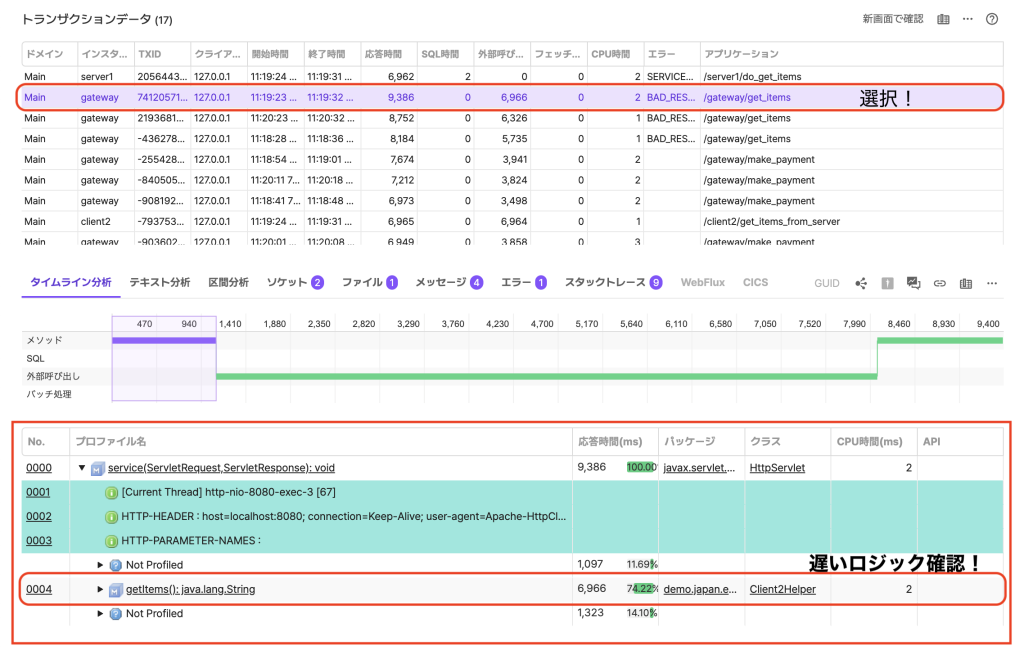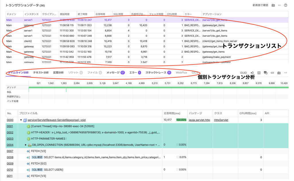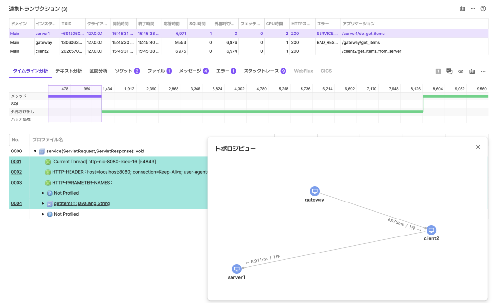 トランザクションのプロファイルデータの詳細情報を確認できます(図6と図7を参照)。