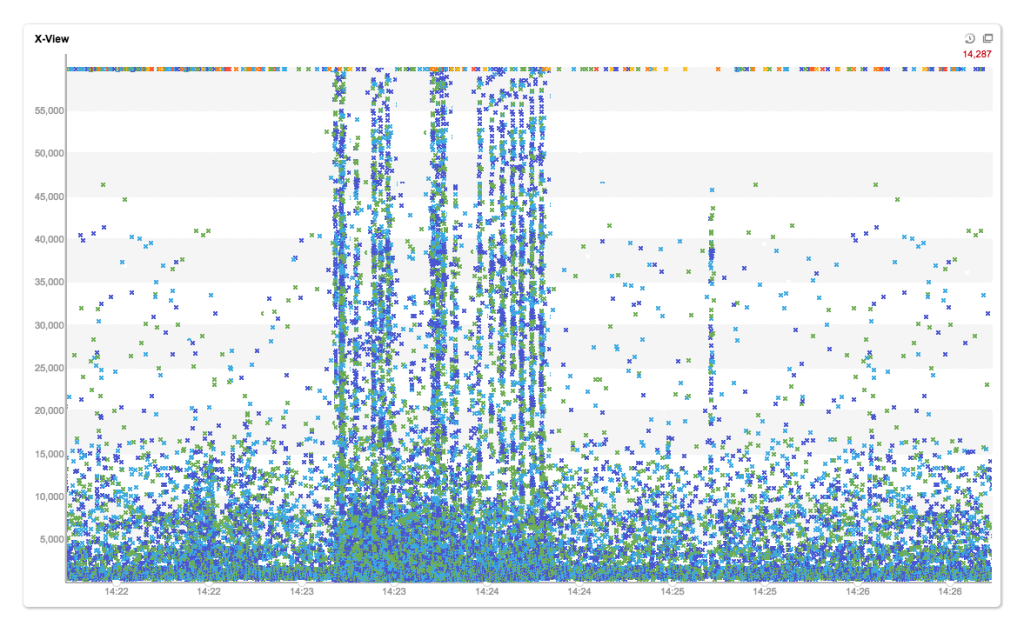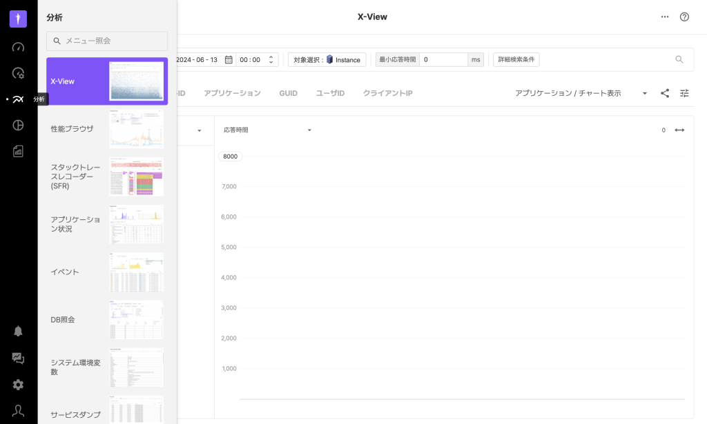 リアルタイムX-View経由で現時点に処理されたトランザクションの応答時間分布を確認できます。更に、Y軸基準変更とフィルタリング機能があります。