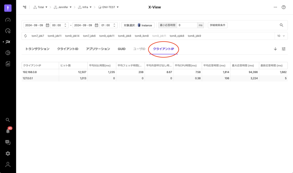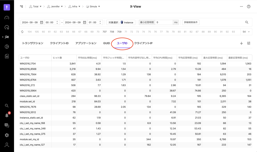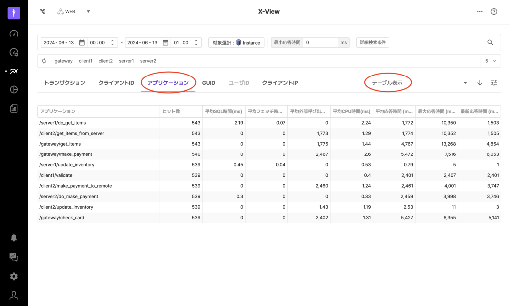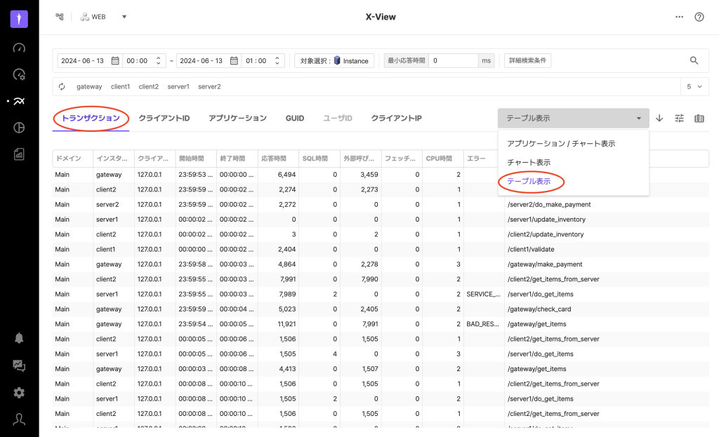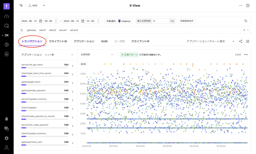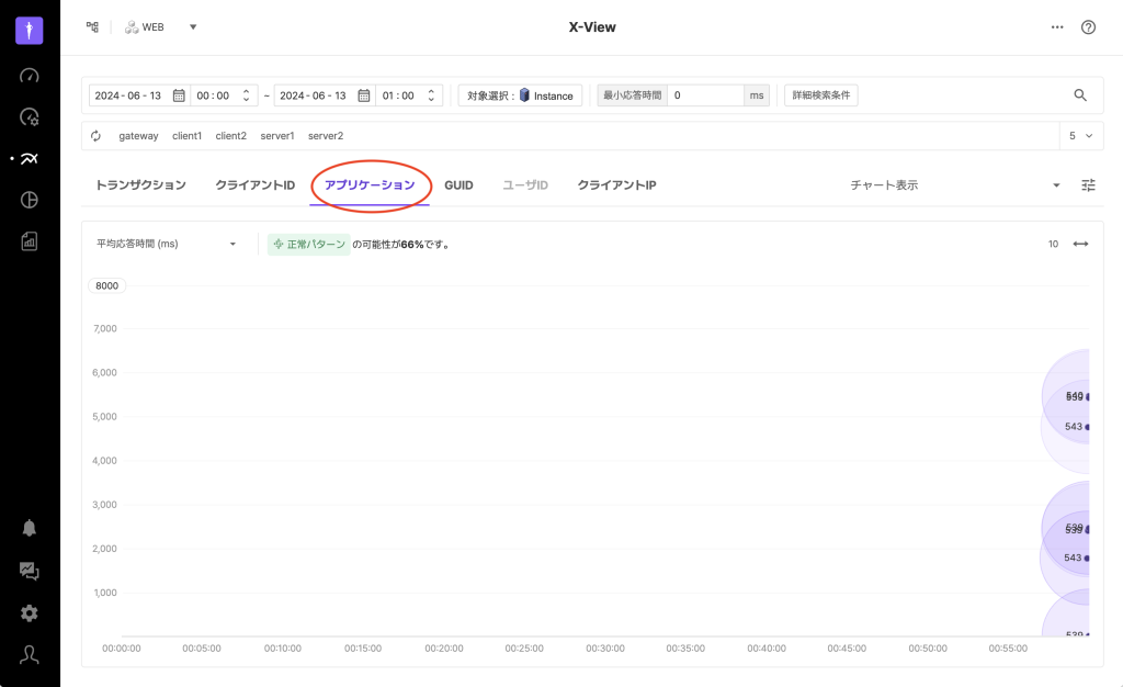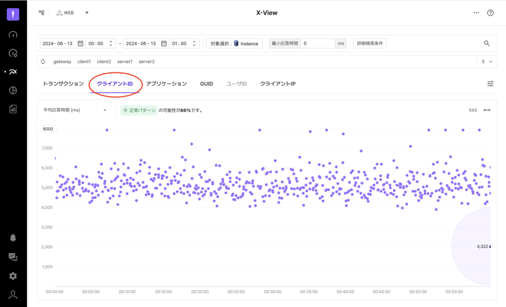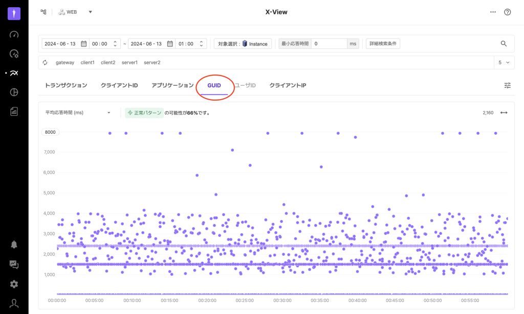 X-View分析では、トランザクションタブの他に、クライアントID、アプリケーション、GUID、ユーザID、クライアントIPのタブを提供します。これらのタブは個別のトランザクションではなく、特定の条件に結びついているトランザクションのグループを1つの点として表示します。