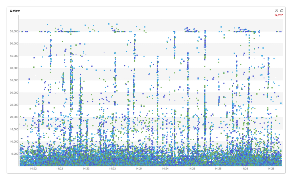 JENNIFERはトランザクションをモニタリングするX-Viewチャートを提供します。X-Viewで表示されている各点は、個別のトランザクションです。また、トランザクションデータをX-View上の点で選択すると、選択したトランザクションデータの詳細情報がポップアップされ、X-Viewトランザクション分析の画面が表示されます。