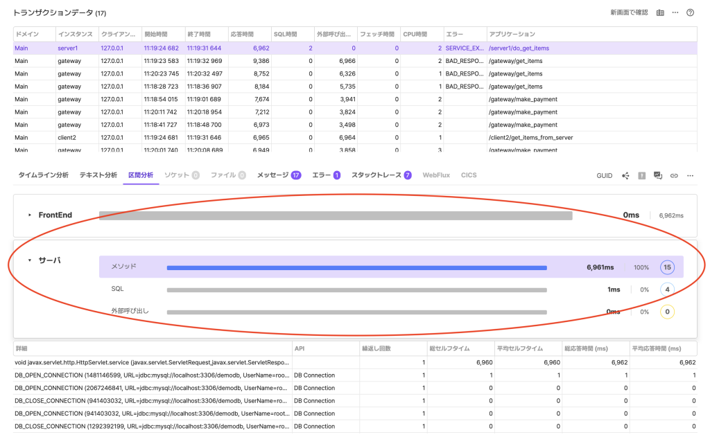 区間分析タブで、トランザクションで実行された様々なプロファイルデータの区間毎の処理時間の割合を確認できます。どの区間でより長い応答時間だったかを一目で把握できます。区間は「Front-End」区間と「サーバ」区間から構成され、各区間を選択すると、該当区間で実行された情報を詳細に分析できます。