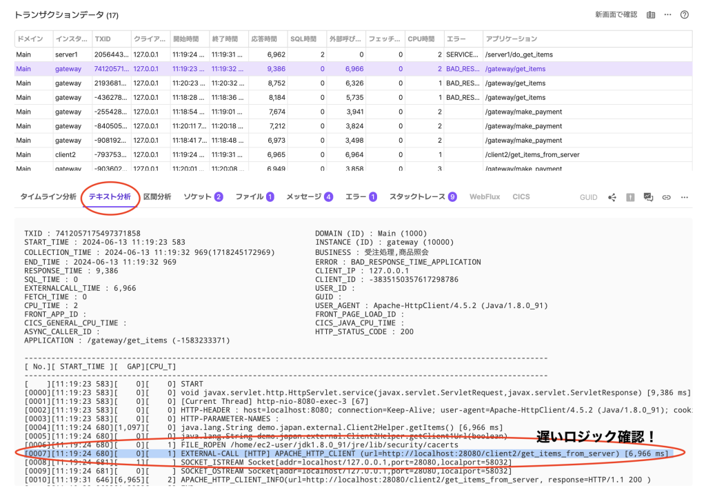テキストには、アプリケーション名や応答時間、プロファイルデータ等のトランザクションの情報が文字列形式で表示され、プロファイルデータの詳細を素早く確認できます(図7を参照)。