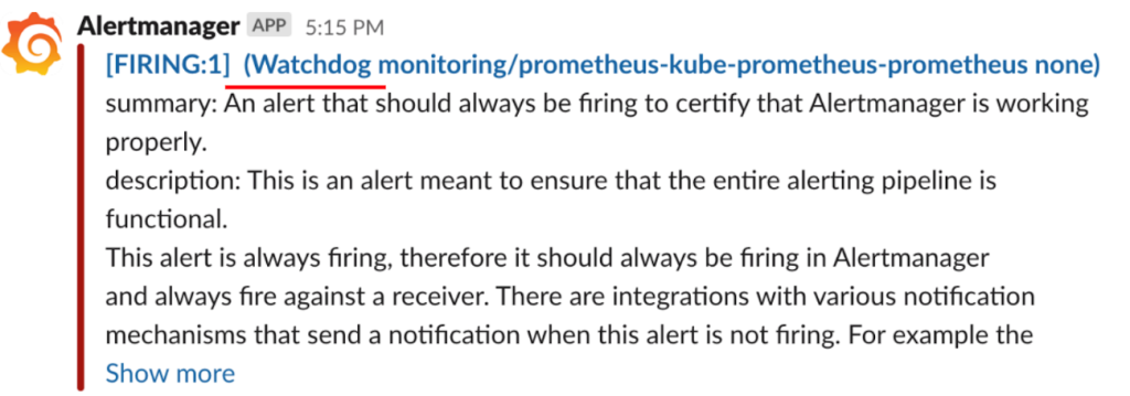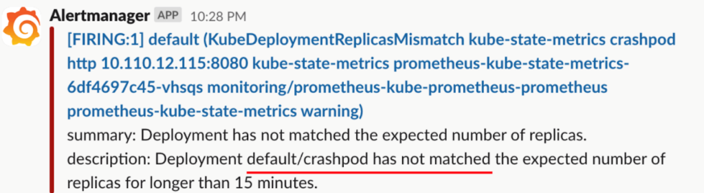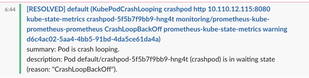 以前のAlertManagerに比べてメッセージが直観的で、メッセージを確認すると直ぐにCrashLoopBackOffエラーであることを確認できます。このメッセージで担当者はより早く障害処理を開始できます。