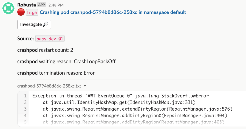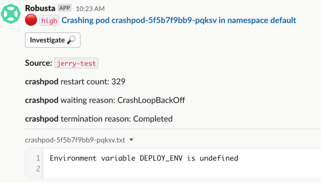 任意でエラーがあるPodを実行してエラーメッセージがSlackに正しく転送されるかを確認します。 Robustaが提供するサンプル Podを使用します。