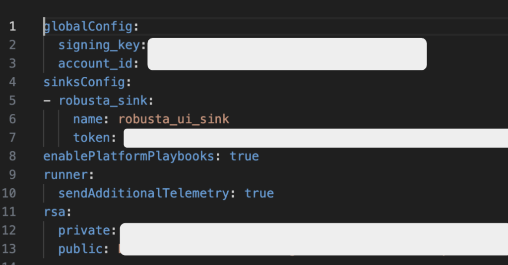 次は生成したRobusta Helm設定ファイル(~/generated_values.yaml)に次の様に Slack関連設定を追加します。