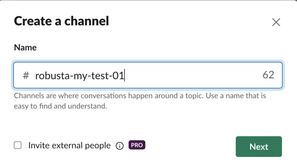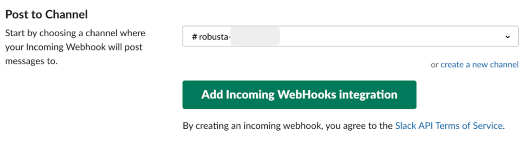 次はrobustaアラートメッセージを受信するSlackチャネルの設定をします。新しい Slackチャネルを作成して、チャネルの webhook urlを設定します。