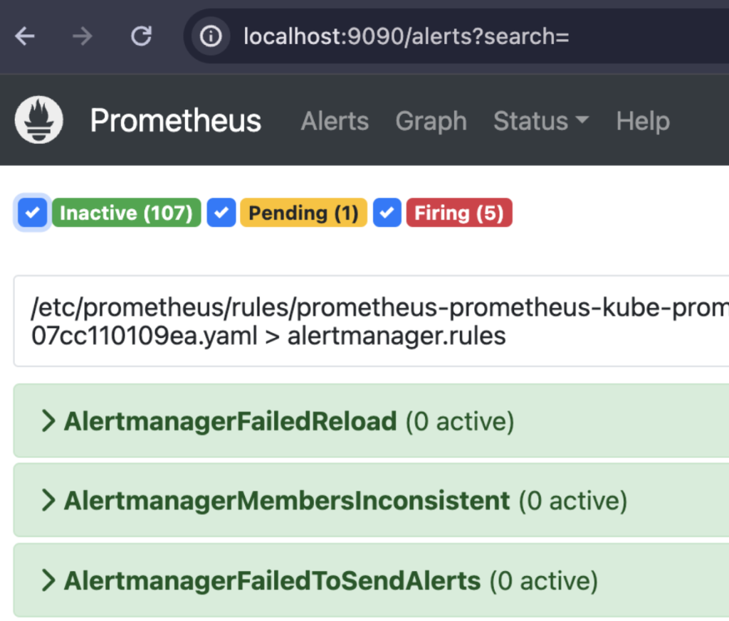 コマンドのみならず全体のアラートルールのリストは Prometheus GUIでも確認できます。