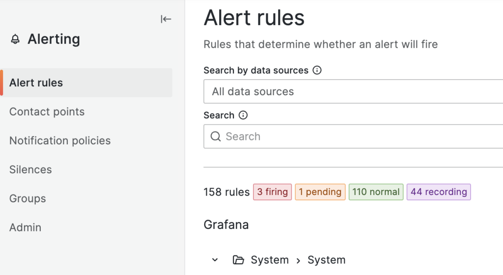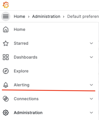 ダッシュボードに関するアラートは Grafanaで直接設定できるので、実際に Grafanaでアラートを設定する方法を確認します。先ず、 Grafanaのアラート関連メニューは下記の様に画面左側にあります。