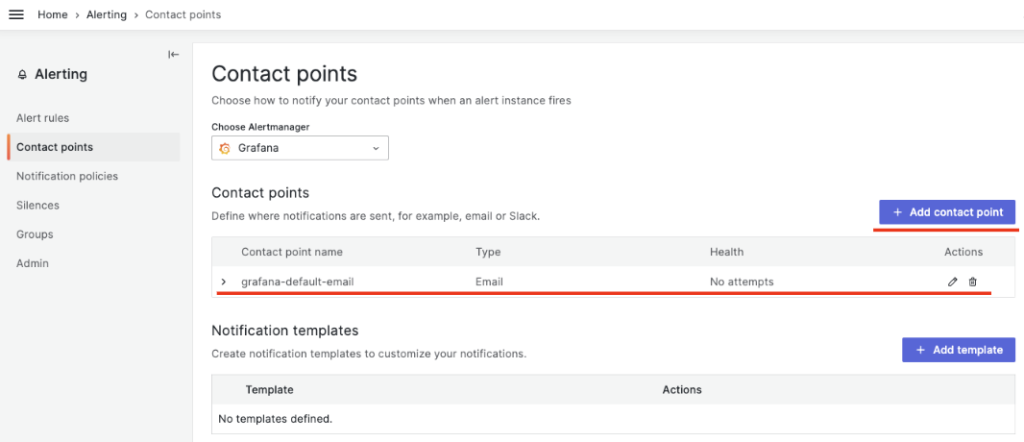 デフォルトでは上記のように grafana-default-emailの設定がされています。筆者はEメールの代わりにSlackを使用します。上段の Add contact pointメニューを選択します。