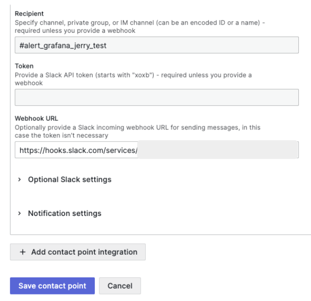 Grafanaはチャネルを便利に統合できるように、多くのチャネルテンプレートを提供しています。Slackの場合は、 Webhook URLだけ入力すると、設定が簡単に完了します。
