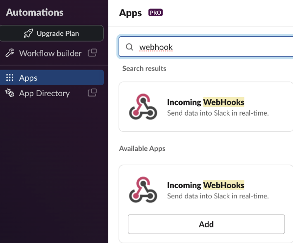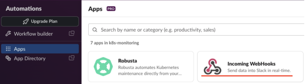 WebHooksでクバネティスアラートを転送する予定であるため、Slackの Appsメニューを選択して‘webhook’と入力します。