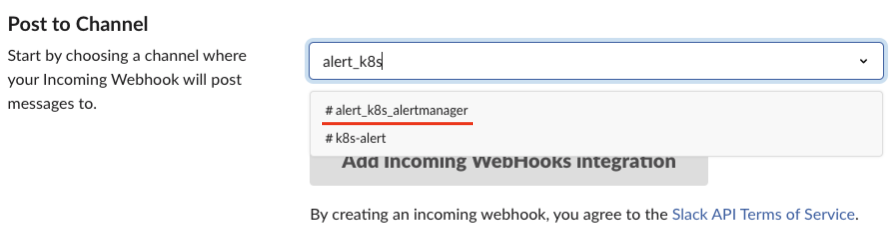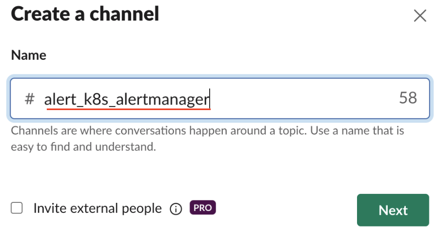 Slackでクバネティスアラートを受信する新しいチャネルを生成します。名前は任意に下記の様に決められます。しかし、これから類似するアラートチャネルを複数作成する予定のため、事前に命名規則(Naming Convention)を指定することを推奨します。筆者はalert_k8s_alertmanagerを指定しました。 alertmanagerは prometheusが提供するアラート関連リソース名です。