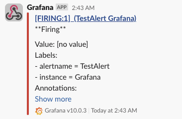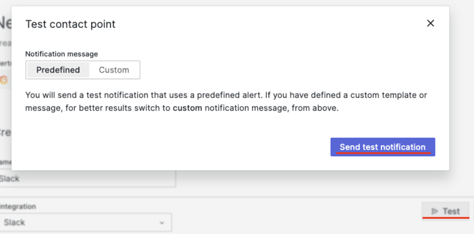 再度、Grafanaに戻ってWebhook URLが正常に設定されているか、Testメニューで確認できます。
