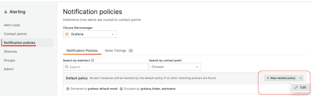 次に Grafanaで発生するアラートがSlackで転送されるため、Grafanaアラートのデフォルト設定を変更します。Notification policiesメニューで設定します。画面左側の…メニューのEditを選択します。