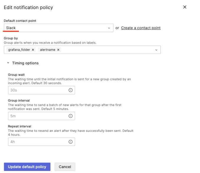 下記でDefault contact pointを新しく生成したチャネルの Slackに変更します。