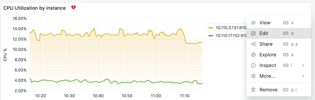 ダッシュボードでノード別 CPU使用率は下記の CPU Utilization by instanceパネルです。アラート設定のために右側上段のメニューで Editを選択します。