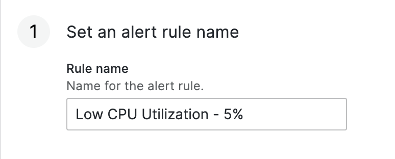 続きの画面では、アラート関連設定をガイドに従って進めます。先ず、アラート名を任意に設定します。 筆者は CPU使用率が5%以下の場合、アラートを受信する予定のため、下記の様に Low CPU Utilization – 5%を指定しました。