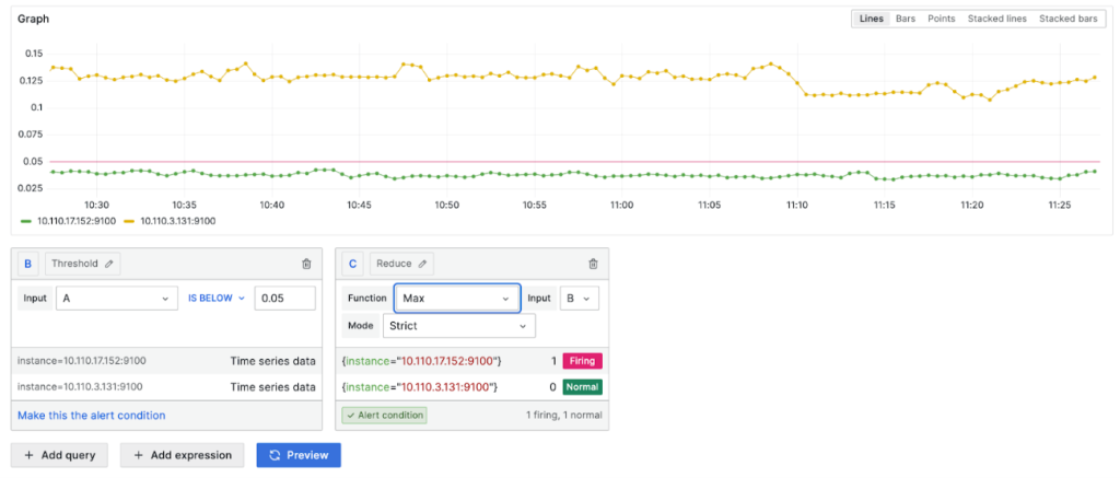 設定を完了してPreviewボタンを選択すると、現在の設定がグラフとFiring、Normalで確認できます。上記の設定で10.110.17.152ノードが5%未満の使用率のため、正常にFiring状態になったことを確認できます。