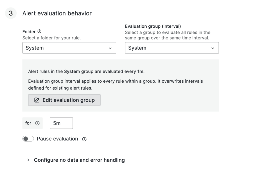 次はアラートの確認周期です。何分間隔 (evaluation)で、どのくらい継続する (for)とアラートを発生するかを設定します。筆者は下記の様に1分間隔で5分間継続するとアラートを発生するように設定しました。