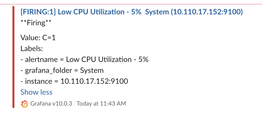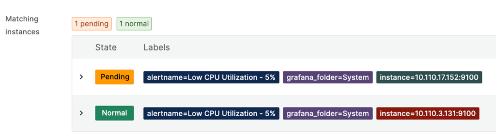 一つのノードの CPU使用率が5%未満で、下記の様に Pending状態を確認でき、設定した5分以上継続するとFiring状態に変更されてアラートを発生します。
