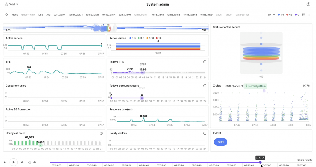 直観的な分析方法であり、複雑な分析ツールではなく、障害が発生した時点のリアルタイムダッシュボードをそのまま確認しながら分析できます。 既存のダッシュボードのモニタリング分析方法と同様に、直観的で素早い問題把握ができます。