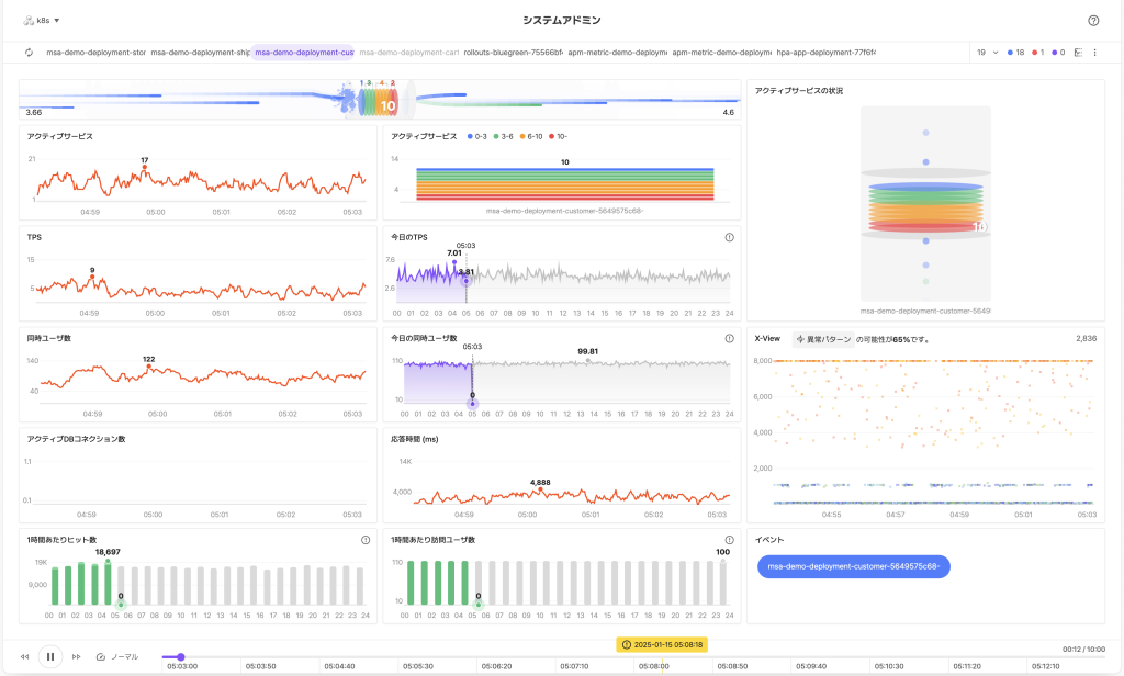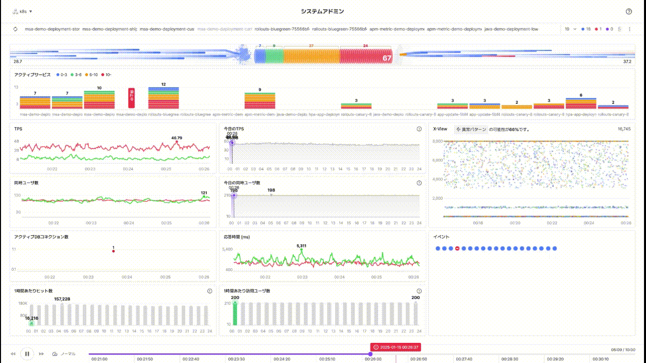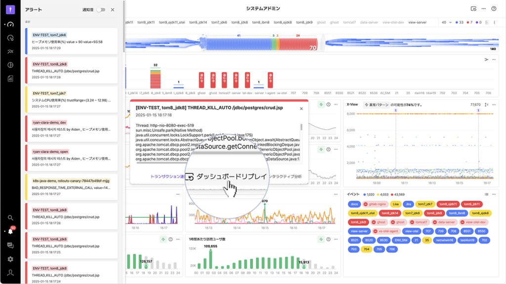 しかし、ダッシュボードリプレイ機能を活用すると、問題のトランザクション発生以前のシステムの状態を再現して、その時点で同じ問題が持続的に発生した場合のように、問題発生前後の全体的なモニタリングの状況を確認できます。これによりユーザはシステムの全体的な状態と変化のパターンをより深く理解できるため、根本的な問題解決策にアプローチできます。