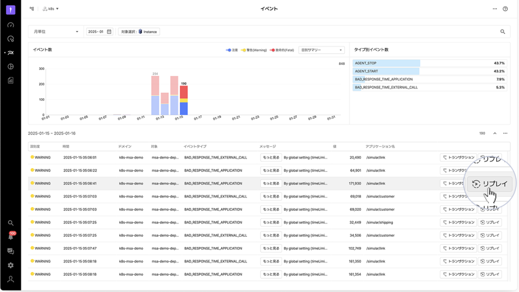 ダッシュボードリプレイデモ画面では、イベント発生時点で急激に応答時間が遅くなるトランザクションを確認できます。