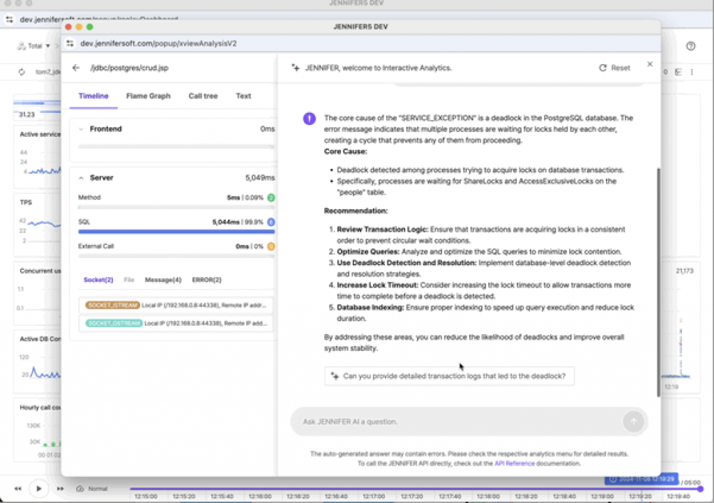 この現象ではシステムの異常を直観的に確認できますが、ユーザが問題の原因を迅速に把握できるようにサポートします。エラーが発生したトランザクションがある区間をドラッグして、X-Viewトランザクション分析画面を表示すると、問題の原因であるデータベース(PostgreSQL)でデッドロックの発生を確認できます。
