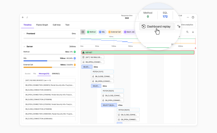 イベント分析と同様にエラーが存在するトランザクションの場合、ダッシュボードリプレイ機能を活用できます。ユーザがX-Viewトランザクション分析画面まで到達すると、既に問題の原因をある程度把握できた可能性があります。