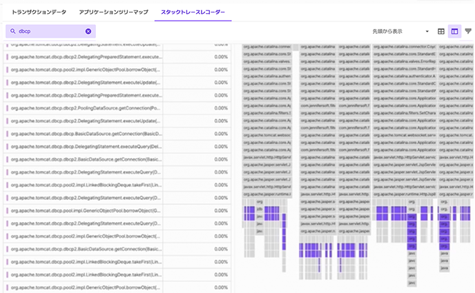 このsleepはDBCP(Database Connection Pool)で発生しており、「DBCP」をキーワードで検索した結果、全体の応答時間の約74%を占めていることが分りました。
