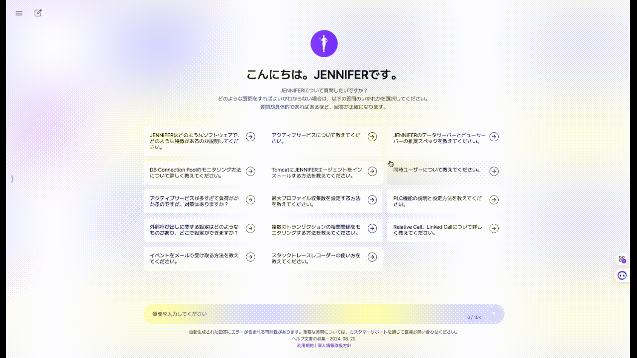 JENNIFER AIは、JENNIFERを使用中に発生する疑問を、24時間いつでも解決できるサービスです。