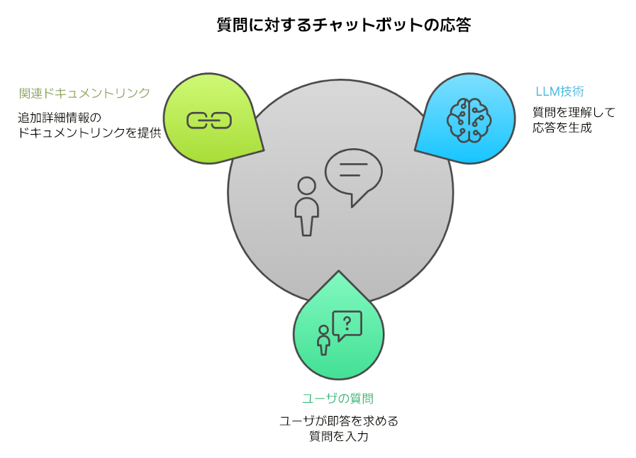 このチャットボットは、最新のLLM(大規模言語モデル)技術を活用し、ユーザの質問の意図を理解し、それに適した回答をします。