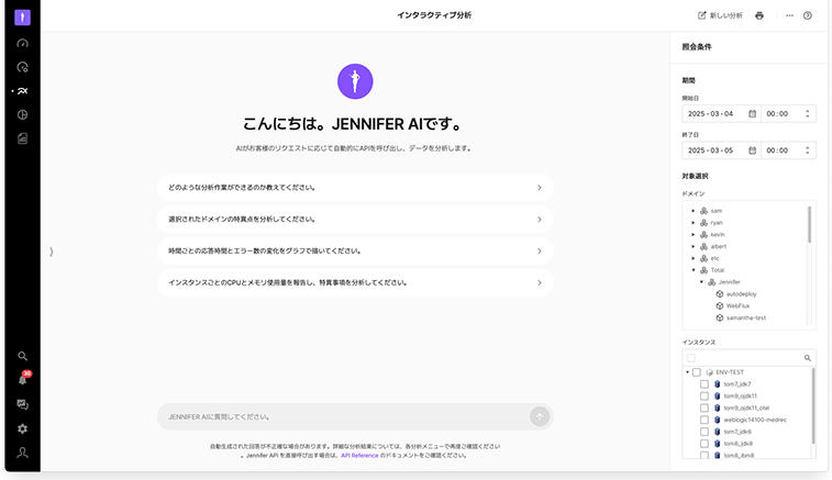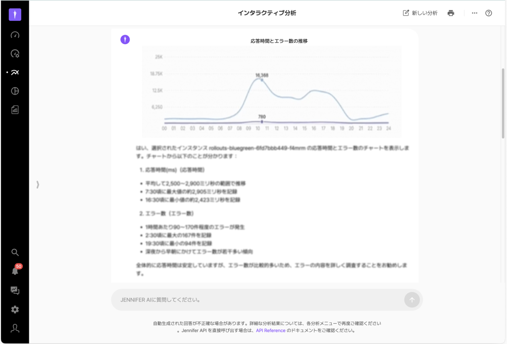 JENNIFER AIの新機能であるチャットボット、対話型分析、X-Viewパターン認識、アプリケーションインサイトは、リアルタイム監視や障害分析をより直感的かつ迅速にするための重要なツールです。