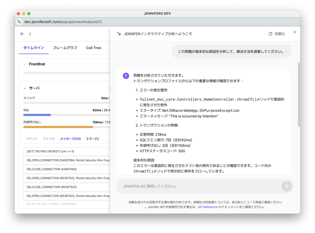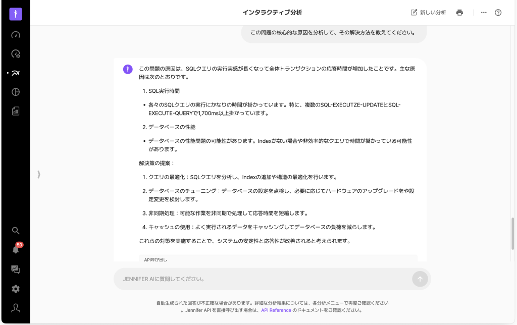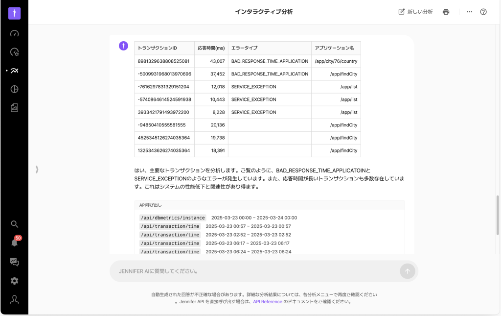また、対話型分析は、LLMが持つ一般的なIT知識に加え、トランザクションデータのスタックトレースやエラーメッセージなどの情報を活用し、問題を診断し、解決策を提示することができます。