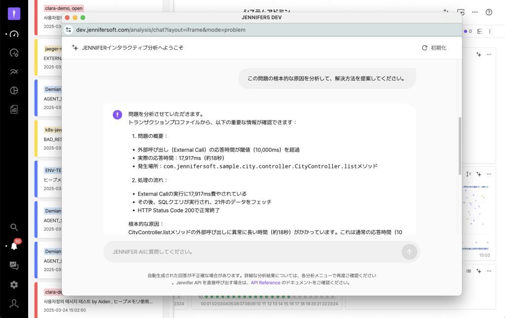 例えば、図26ではBad Response Timeエラーが発生したトランザクションについて質問すると、AIは「応答速度の低下の原因は外部呼び出しにある」と診断します。