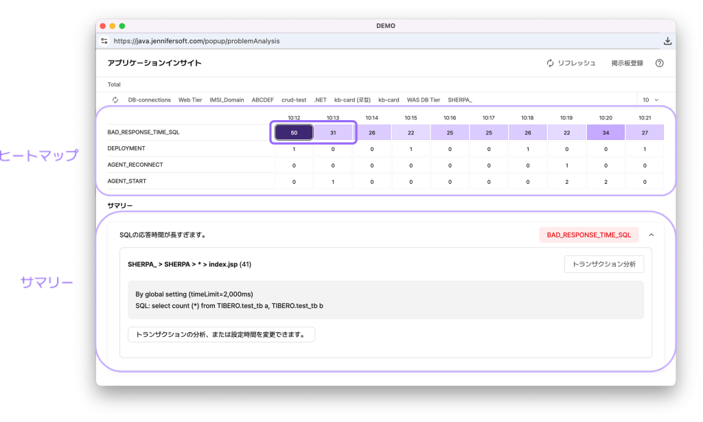 サマリーカードには、「SQLの応答時間が長すぎます」といった簡単な説明とともに、「トランザクションの分析、または設定時間を変更できます。」という推奨アクションが表示されます。
