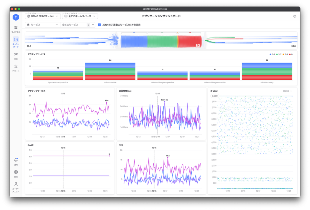 再配布後はJENNIFER Kubernetesアプリケーション統合ダッシュボードでデプロイメントまたは個別Podの状態と処理中のトランザクションの状況をリアルタイムにモニタリングできます。