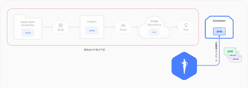 アプリケーションイメージ自体はAPMエージェントに対する従属性がなくピュアに維持されます。これはイメージビルドのプロセスを単純化して、イメージサイズを削減し、APMエージェントのバージョンアップグレード時に、アプリケーションイメージを再ビルドする必要がありません。