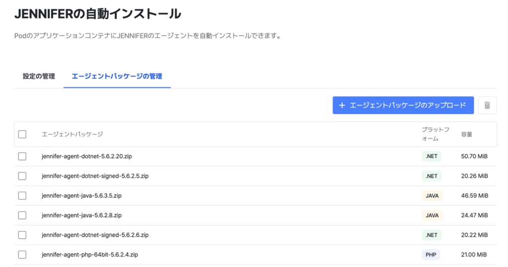 1つ目はパッケージ管理です。自動インストールメニューの 「エージェントパッケージの管理」でJENNIFERエージェントを言語別 (JAVA、.NET Core、PHP、Python)、バージョン別に登録します。エージェントパッケージがバージョン別に登録されるため、パッケージのヒストリー管理もできます。