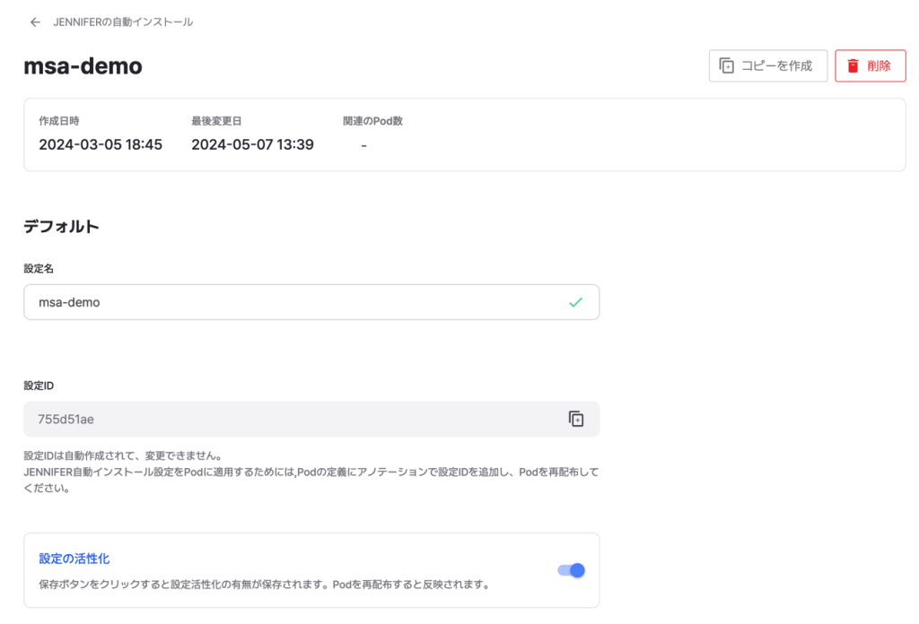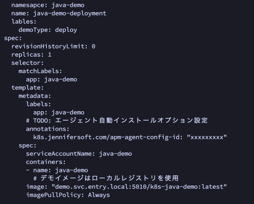 例) k8s.jennifersoft.com/apm-agent-config-id:“a1b2c3d4” をデプロイメントの中のPodのメタデータ領域に追加し、設定IDを付加して再配布をすると、即座にアプリケーションモニタリングを開始します。