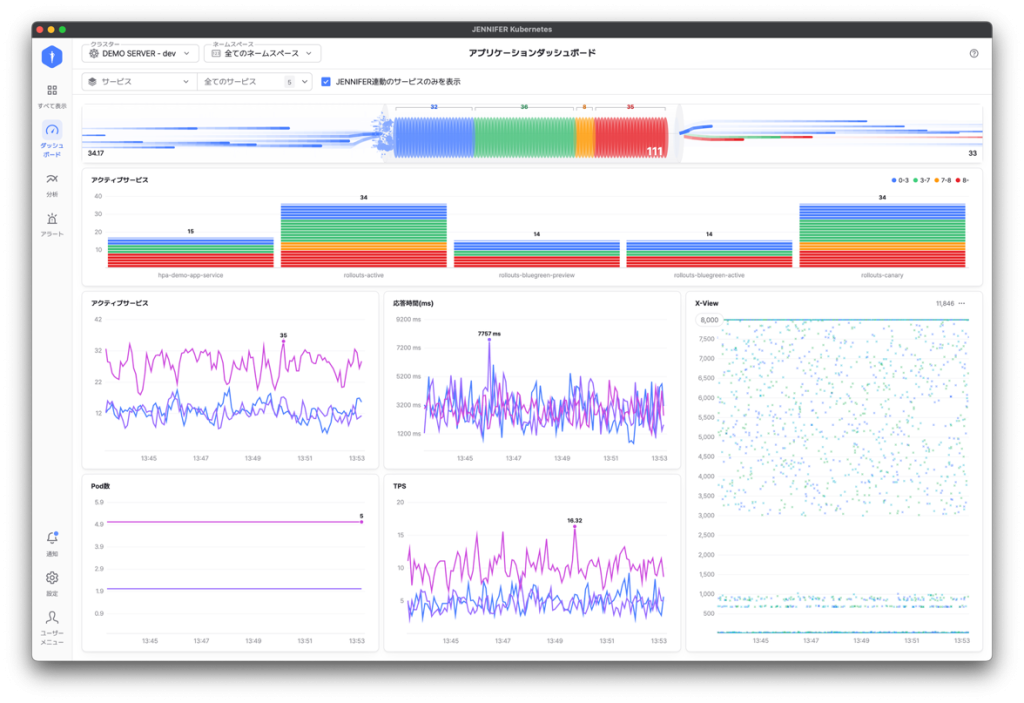 再配布をするとJENNIFER Kubernetesアプリケーション統合ダッシュボードでデプロイメントまたは個別Podの状態と処理中のトランザクションの状況をリアルタイムモニタリングできます。