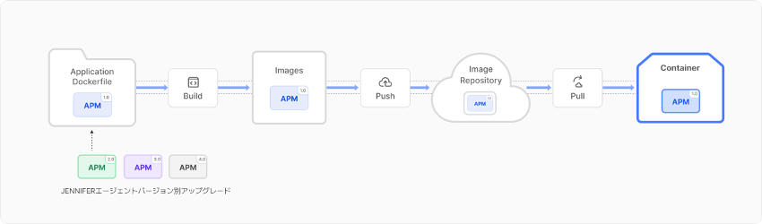 エージェントにはバグがある可能性があり、最新ライブラリのサポートのためにもエージェントのアップグレード作業は必要です。この場合、アプリケーション内に変更がなくてもイメージの新規生成から、アップロード、配布までの一連のプロセスが必要です。既存のJENNIFERではエージェントアップグレード機能を設定画面でサポートしますが、コンテナ環境ではアプリケーションが実行する度に既にインストールしているバージョンで再度生成されるため、新しい方法が必要でした。
