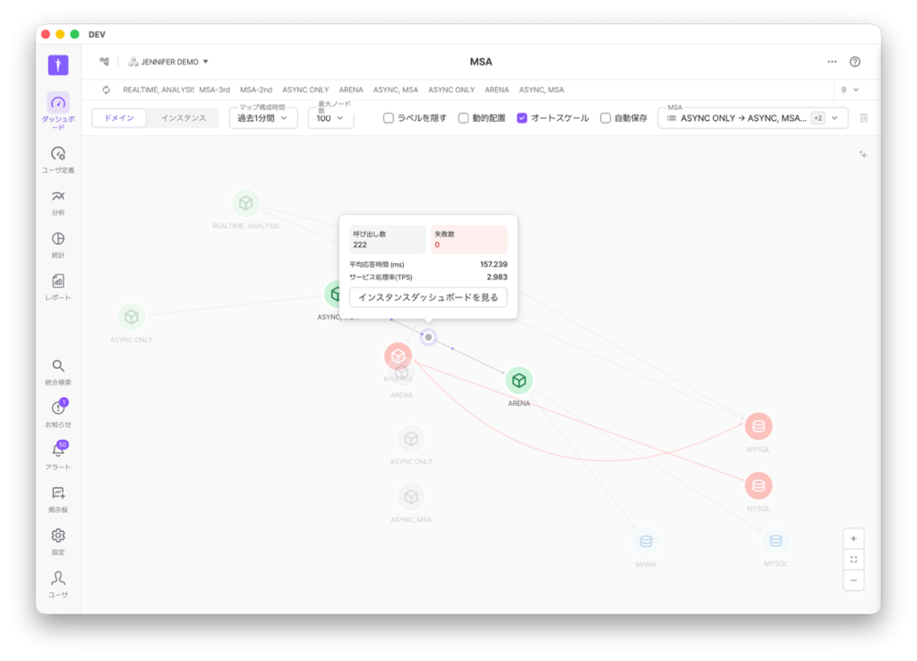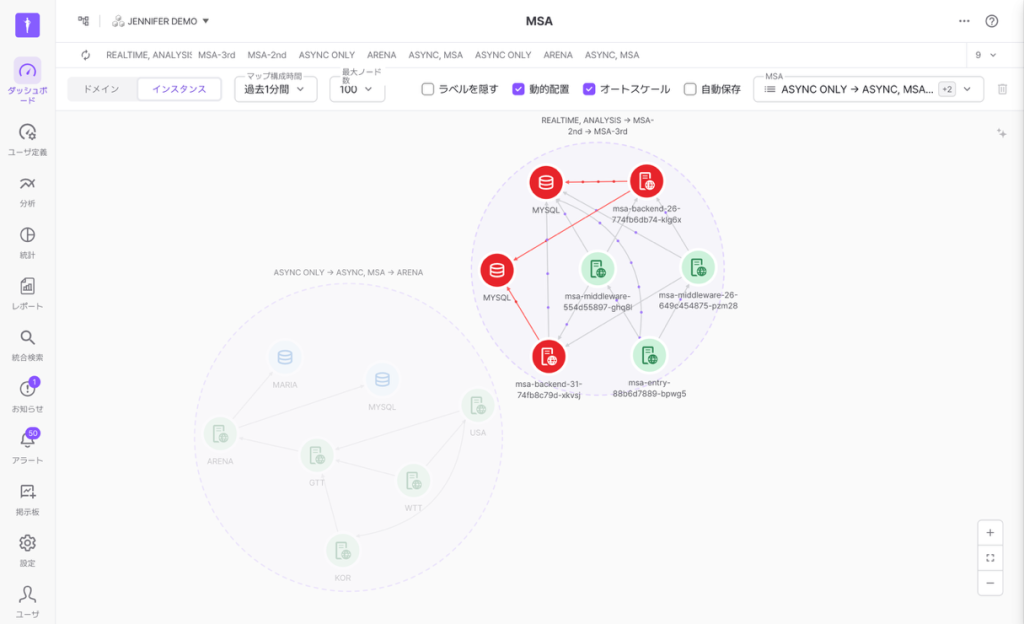 リアルタイムMSAダッシュボード:20秒毎に自動更新されるサービスマップで、全体の状況を一目で把握でき、個別サービスまで段階的に分析できます。