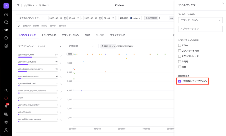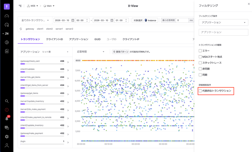 全ての問題をディープラーニングで解決する必要はありません。適切な工夫を行えば、シンプルなルールだけでも多くの課題に対応できます。代表トランザクションは、応答時間やエラー種別などを基準に類似したトランザクションを自動的にグループ化するルールベース機能です。X-Viewで確認すべきトランザクション数を大幅に削減し、重要なポイントに絞った迅速な分析を可能にします。