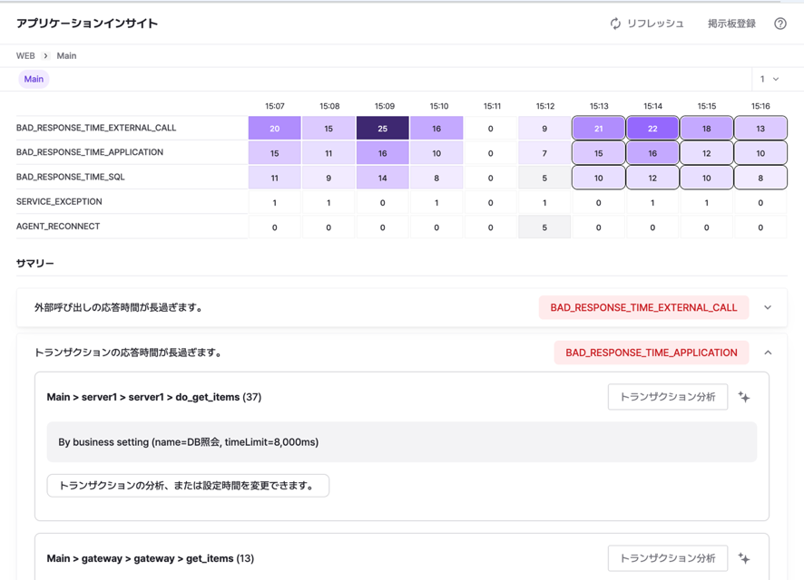 アプリケーションインサイトでは、ヒートマップチャート上で「SERVICE_EXCEPTION」や「BAD_RESPONSE_TIME」といった問題の種類と発生頻度をリアルタイムに表示します。特定の問題を選択すると詳細分析のポップアップが表示され、「どのアプリケーションで問題が発生しているか」といった具体的な情報を確認できます。更に、トランザクション分析など次に取るべき対応も提案されるため、問題の検知から詳細分析、原因特定までを一つの流れとして効率的に進めることができます。
