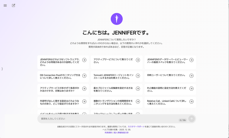 先ず、多くのユーザーに既にご利用いただいているヘルプチャットボットをご紹介します。JENNIFERはAPMソリューションであるため機能が豊富で、専門用語も多く、マニュアルから必要な情報を探し出すのが難しい場合があります。ヘルプチャットボットは、こうした不便さを解消するために開発されました。