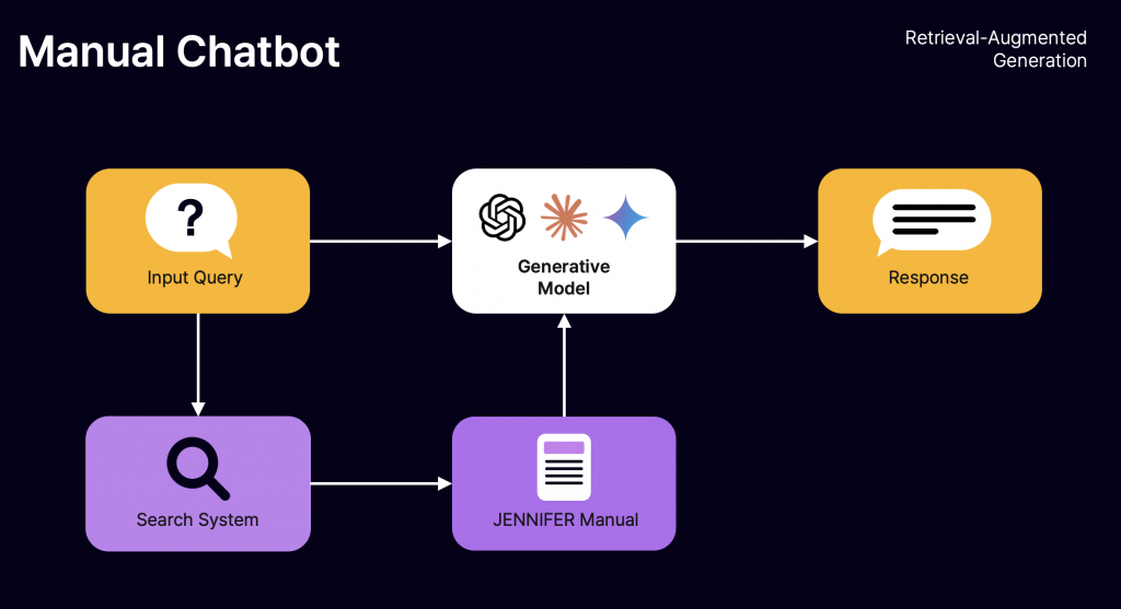 この機能は、RAG(Retrieval-Augmented Generation)技術によって実装されています。JENNIFERのマニュアルからユーザーの質問内容に最適な情報を検索し、正確な回答を生成します。ここで重要となるのが検索品質です。最良の結果を提供するため、検索システムはJENNIFER専用に独自開発されており、汎用的なソリューションよりも高精度な回答を実現しています。