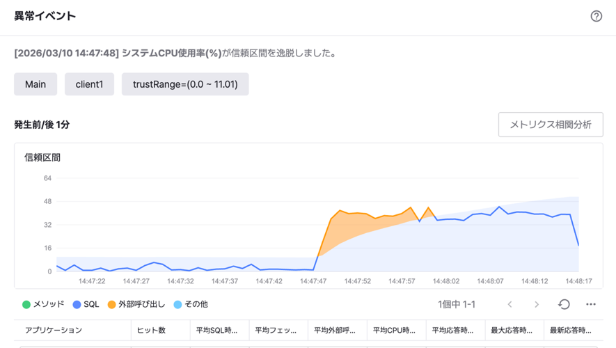 異常イベントによって異常の兆候を検知した後は、メトリクス相関分析で原因を追跡できます。例えばCPU使用率が急上昇した場合、それがトラフィック増加によるものか、あるいはメモリの逼迫が原因なのかを判断する必要があります。JENNIFERはピアソン相関係数を用いて、メトリクス間の関連性を数値として可視化します。